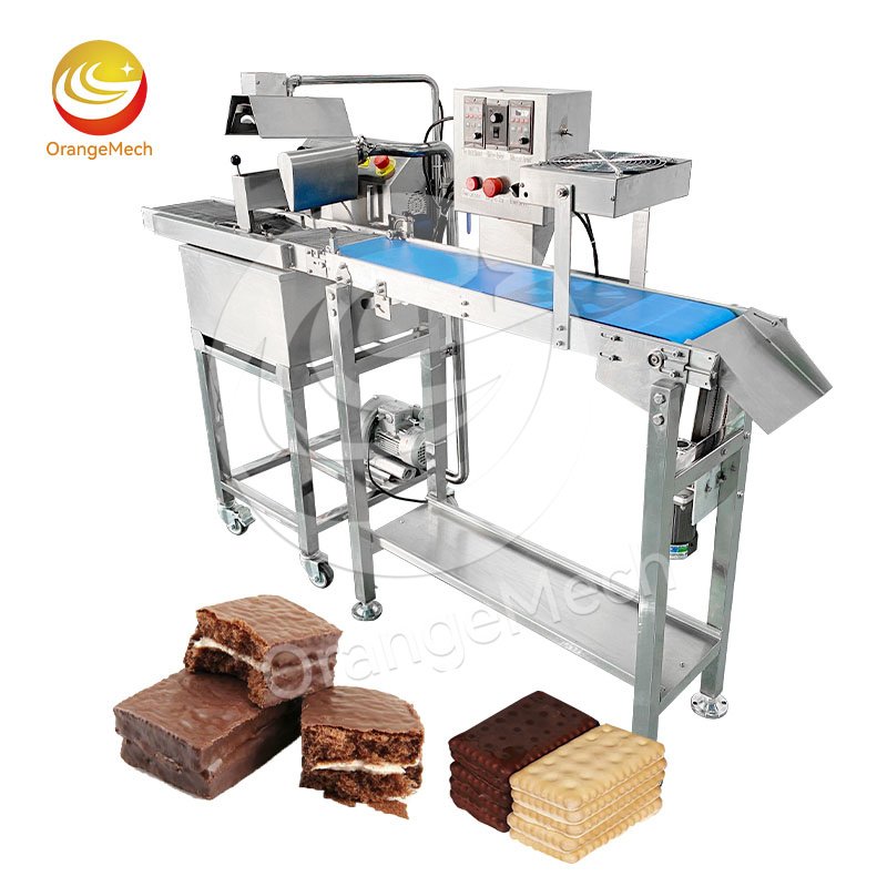 It can be applied to chocolate coating processing of biscuits, nuts, sweets, cakes and other products. Uniform coating can be achieved for both brittle biscuits and soft cakes. The equipment is especially suitable for small batch and multi-variety production requirements.