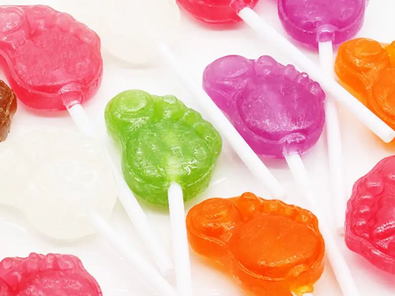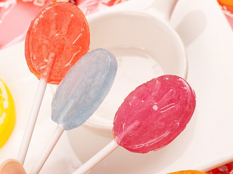 2.3. Compared with soft lollipops, the pretreatment of hard lollipops is more complicated. The boiled solution is transferred to a sugar kneading device (manual or mechanical device), and the liquid solution with a temperature of about 140°C is kneaded to a sugar mass cooled to about 80°C, and then the sugar mass is put into a heat-preserving roller bed and a drawing machine for stretching, and finally it is molded in a lollipop molding machine. The lollipop-forming machine is a turntable mechanism with a mold. The candy bars are sent to the turntable mechanism. When the mold on the mechanism is closed, the candy bars are cut into small pieces with a fixed length, and then the small pieces fall into the mold and are extruded. Finally, the molded products fall off with the rotation of the mechanical mechanism.